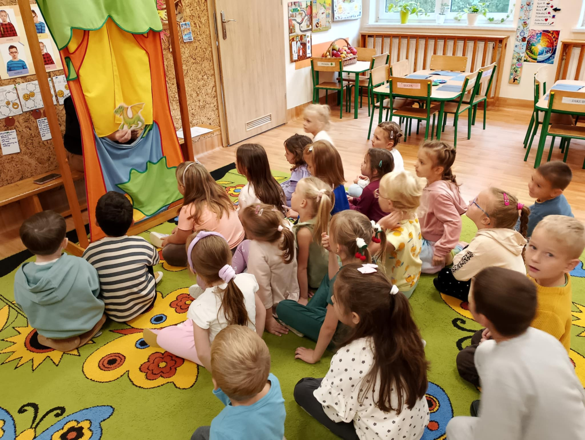 W dniu 21.11.2025 nasze przedszkole odwiedził Teatrzyk "Zielony Melonik" który przedstawił wspaniałą sztukę „Ukryte ziarenko”, opowiadającą o naszych ukrytych talentach.