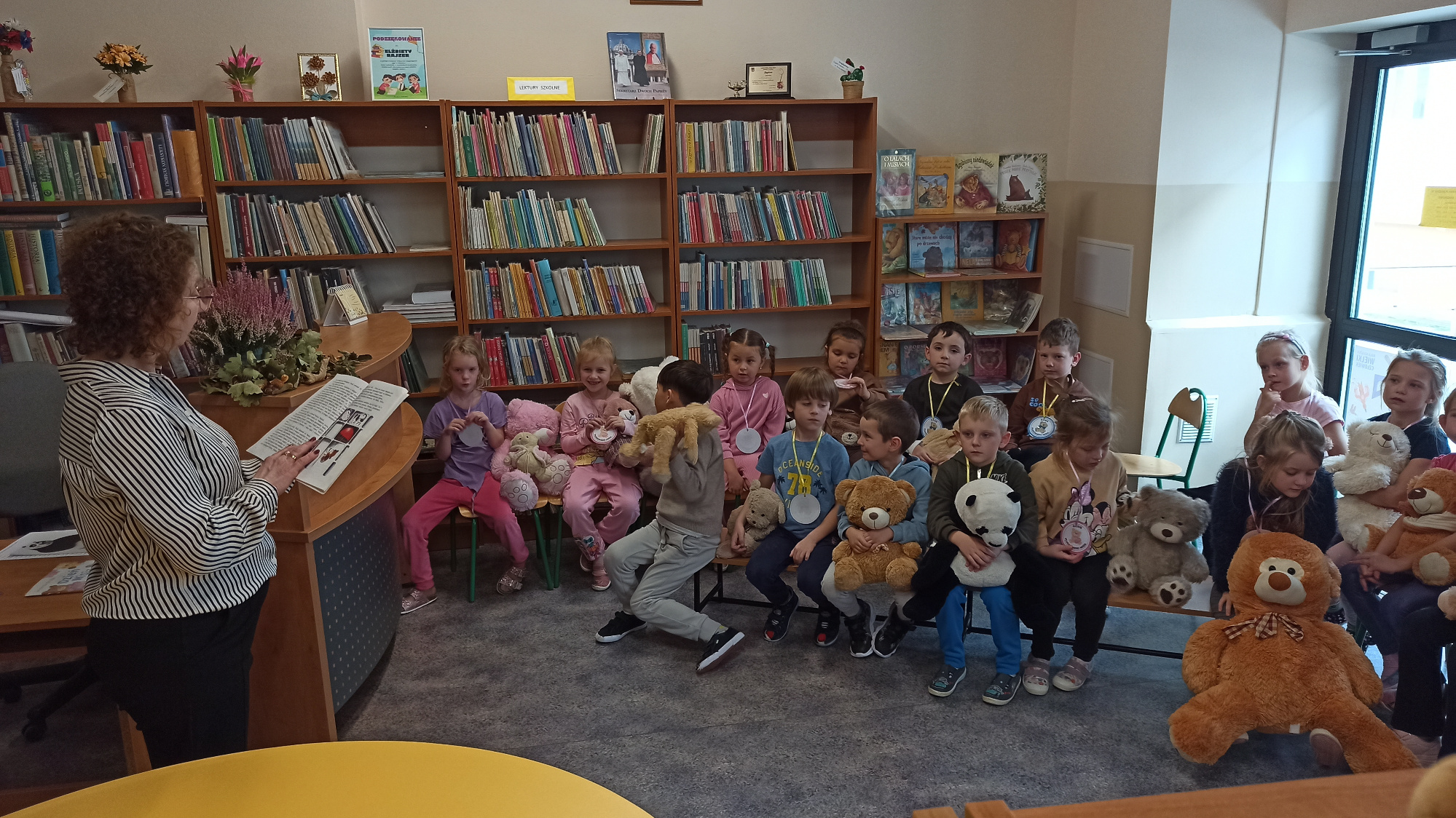 Popołudnie spędziliśmy w Publicznej Bibliotece w Kraczkowej, gdzie Pani Bibliotekarka czytała opowiadania o misiach i zadawała dzieciom zagadki o znanych bajkowych bohaterach. To był pełen uśmiechu, ciepła i wyobraźni dzień w świecie pluszowych przyjaciół.