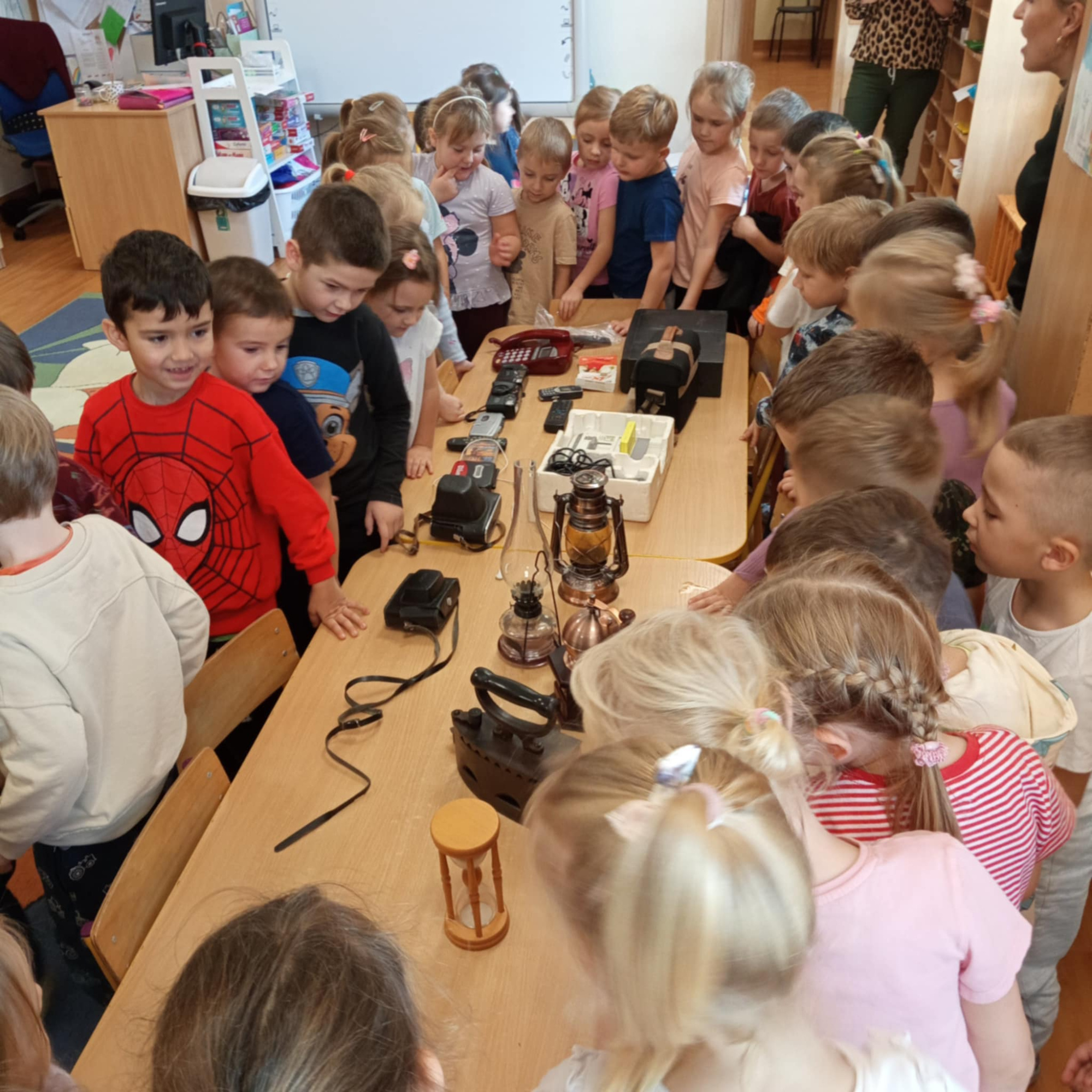 W trakcie zajęć oglądaliśmy także lampy naftowe, które kiedyś były podstawowym źródłem światła, oraz klepsydrę, dawny sposób odmierzania czasu. Dzieci dowiedziały się, co dziś je zastępuje – od żarówek po nowoczesne zegary i timery. Mogli dowiedzieć się na jakiej zasadzie działało „żelazko z duszą”. Nie zabrakło również urządzeń związanych z muzyką i filmem: magnetowidu oraz starych odtwarzaczy muzyki, które porównaliśmy z obecnie używanymi odtwarzaczami cyfrowymi i platformami streamingowymi. Zapoznały się również z wyglądem innych starych urządzeń, które z czasem ewoluowały.