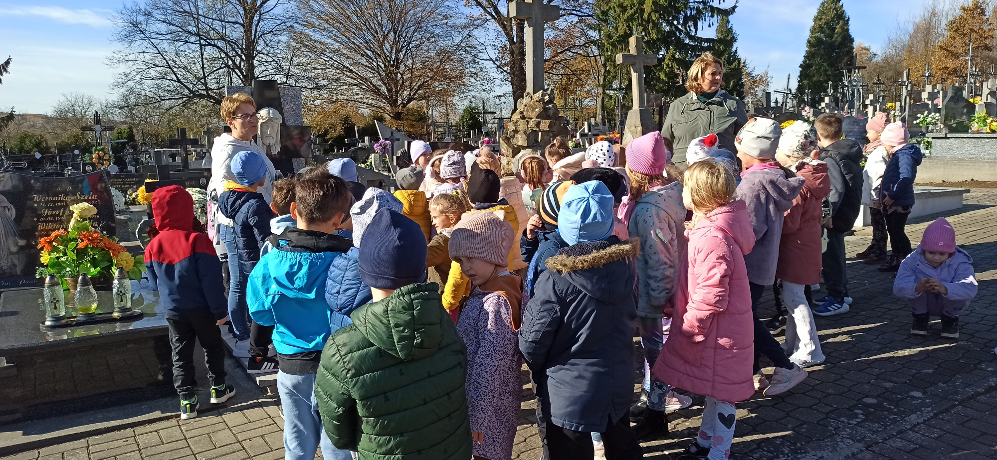 W przeddzień uroczystości Wszystkich świętych, 31 października dzieci z grupy „Motylki”, „Kotki”, „Biedronki”, „Misie”, „Pszczółki” udały się na pobliski cmentarz. Głównym celem tego wyjścia było wysłuchanie krótkiej opowieści na temat przeszłości naszej Ojczyzny oraz zapalenie zniczy na Grobie Nieznanego Żołnierza. Taką postawą dzieci oddały hołd poległym, którzy walczyli w obronie naszej ojczyzny. Dzieci w chwili zadumy pomodliły się oraz uczciły pamięć Żołnierzy minutą ciszy.
