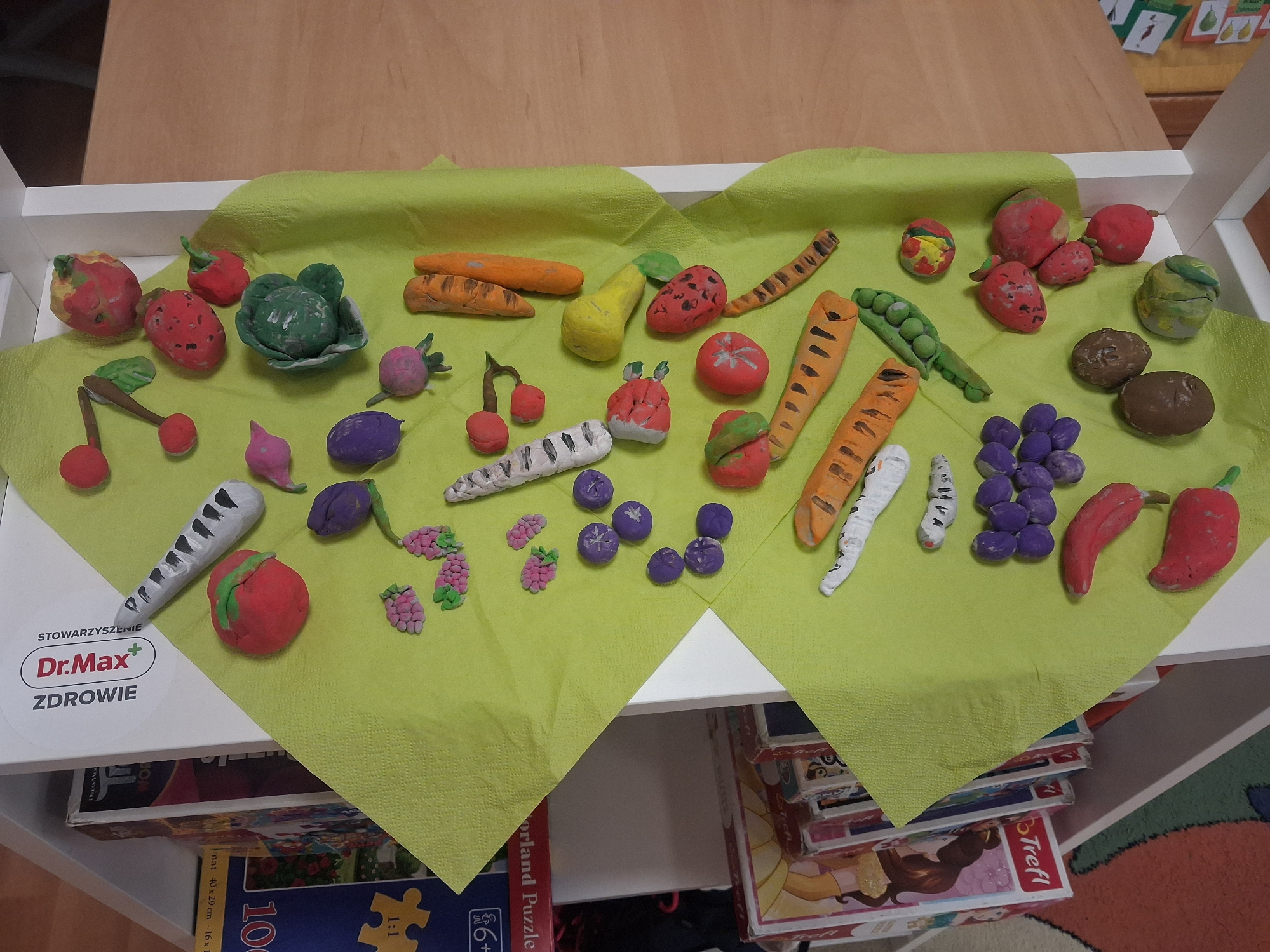 Grupa "Misie" wzięła udział w projekcie realizowanym przez Stowarzyszenie Dr. Max Zdrowie pod hasłem „Codzienna Aktywność, radosna edukacja”. W ramach kolejnych działań dzieci obejrzały teatrzyk pt. „Jarzynowa awantura”, który stał się punktem wyjścia do rozmowy na temat znaczenia spożywania warzyw i owoców w codziennej diecie. Przedszkolaki wysłuchały także prezentacji o roli witamin w organizmie, przygotowanej i przedstawionej przez panią farmaceutkę. Dzieci aktywnie uczestniczyły w lekcji, chętnie dzieląc się swoimi spostrzeżeniami. Na zakończenie zajęć wykonały prace plastyczne – rysowały swoje ulubione warzywa i owoce, a także lepiły je z gliny.