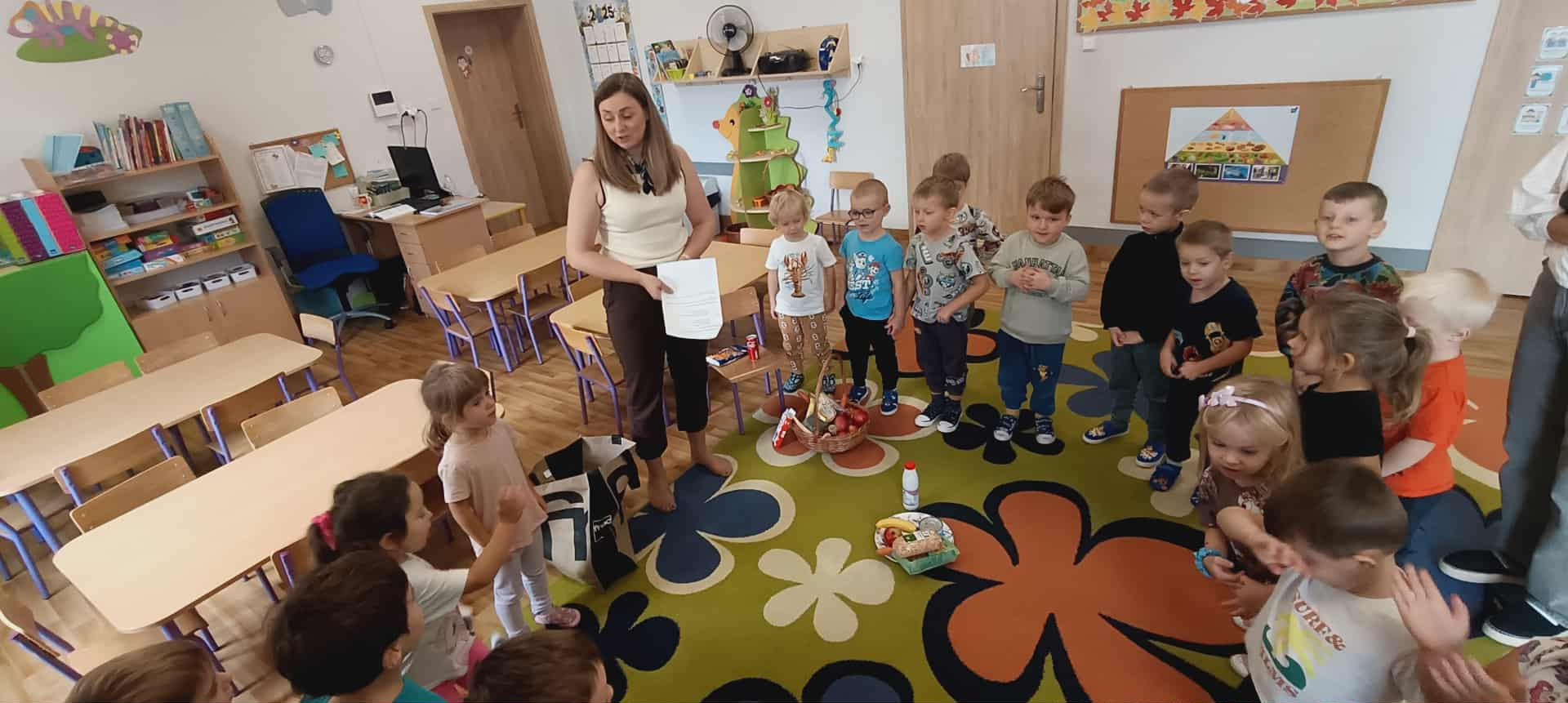 Grupa biedronek gościła Panią Alicję Międlar mamę Zuzi, która opowiedziała dzieciom o zdrowym odżywianiu. Wspólnie z dziećmi zrobiły koszyk „dobrego jedzenia”. Przedszkolaki oddzielały zdrowe jedzenie od niezdrowego. Wysłuchały opowiadanie o warzywach i owocach. A na końcu wszyscy wspólnie razem uczestniczyli w zabawie ruchowej.
